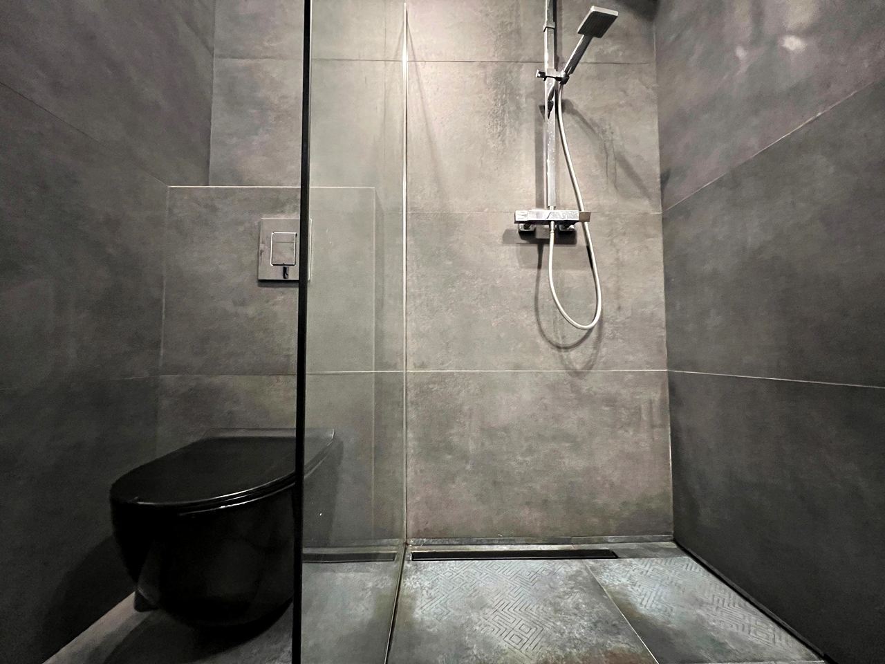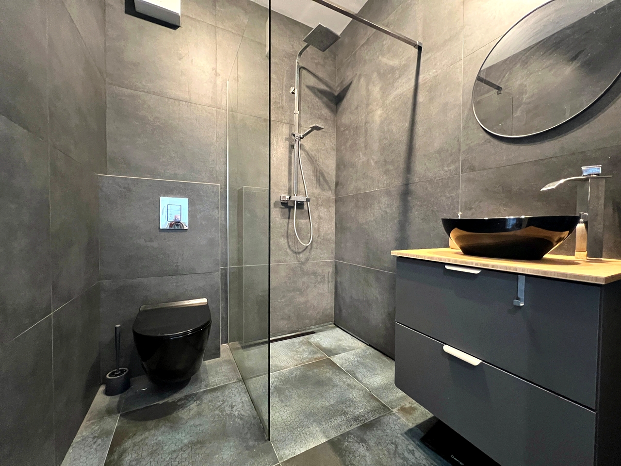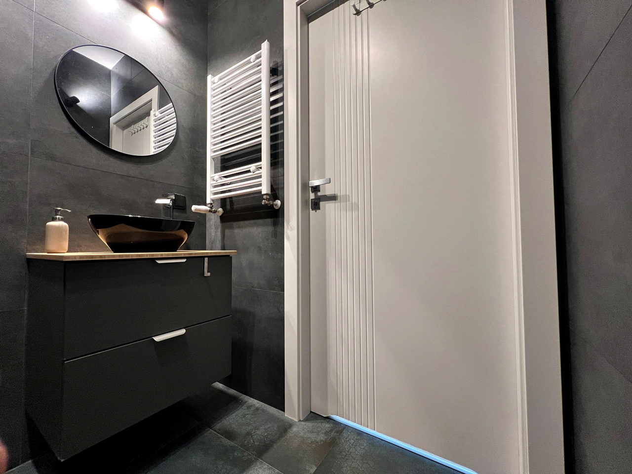 2 łazienki – jedna w stylu industrialnym z prysznicem i WC, druga elegancka z wanną,