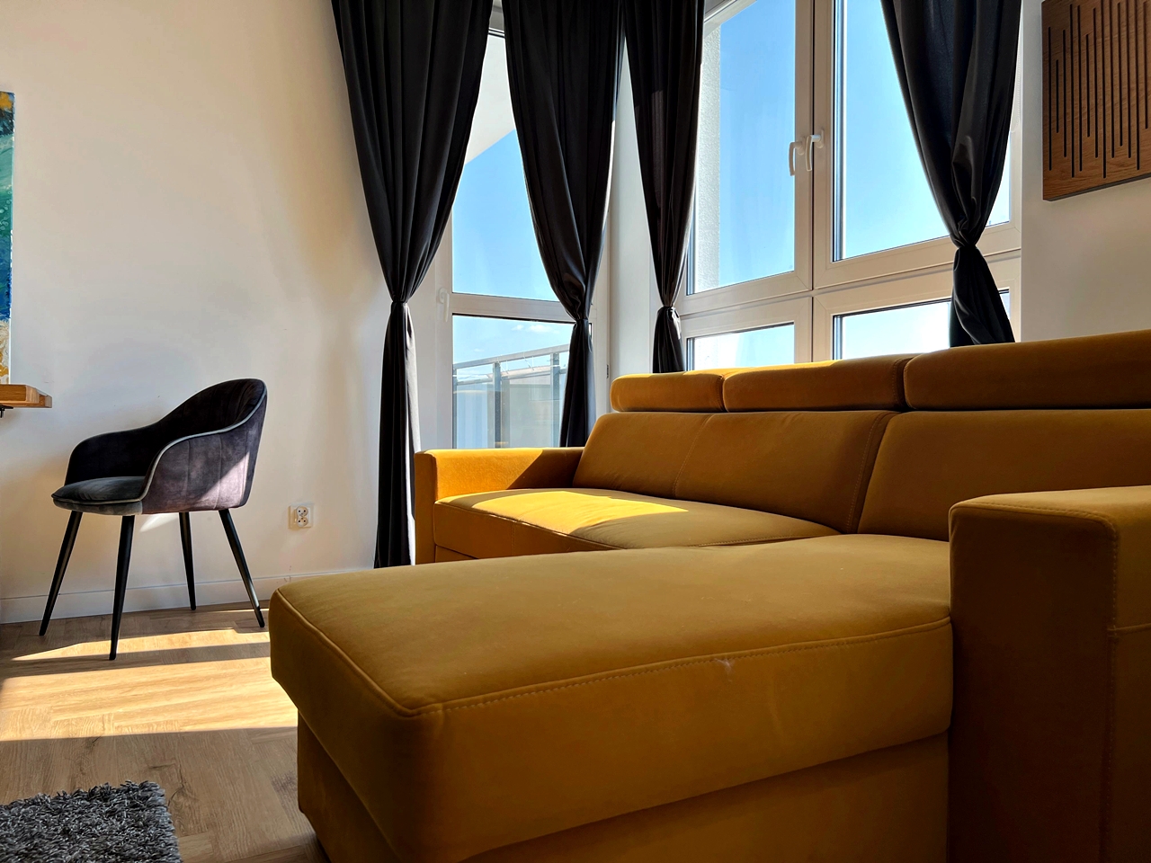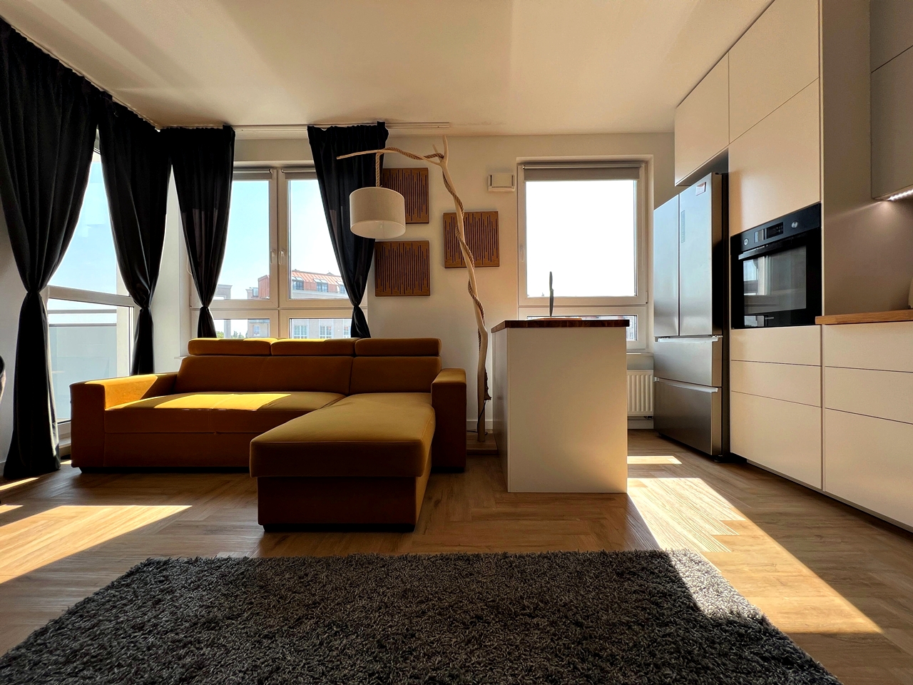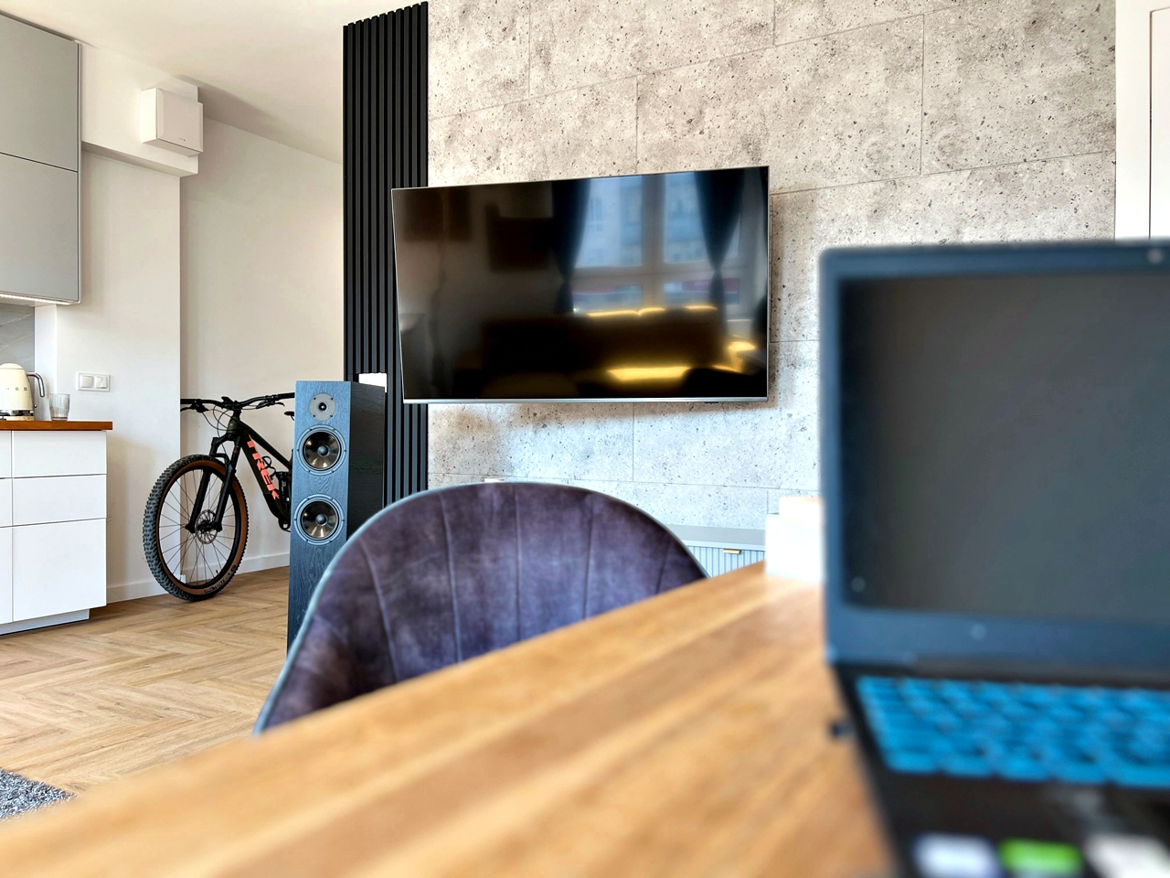 - salon z aneksem kuchennym – urządzony ze smakiem, w pełni wyposażony w sprzęt AGD, z wyjściem na balkon,